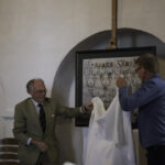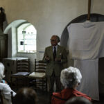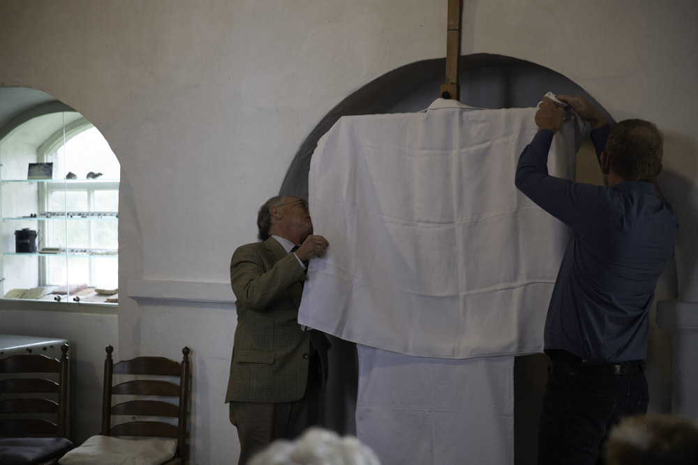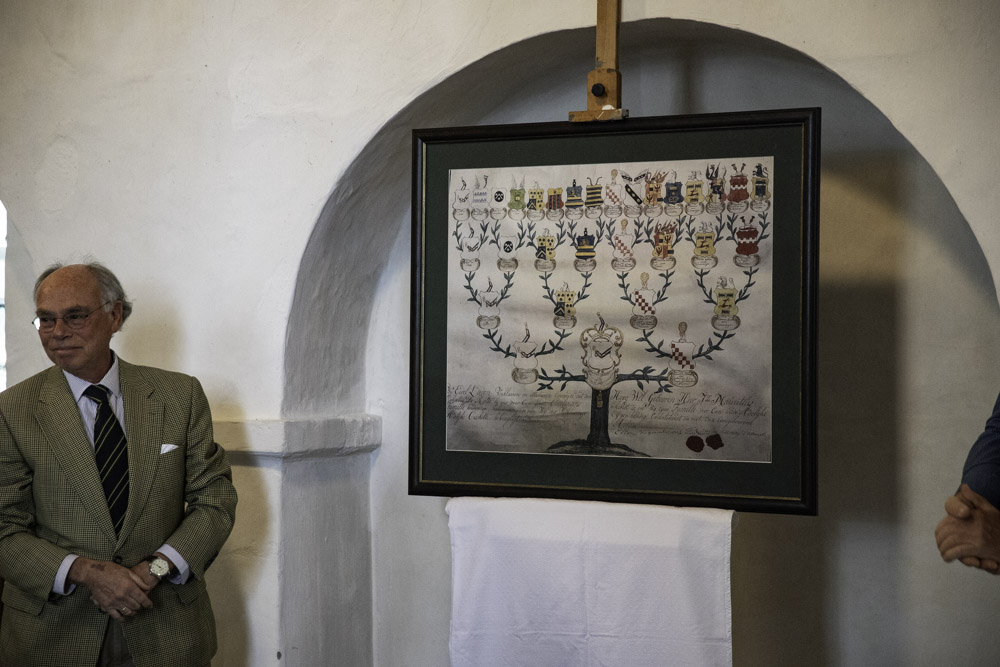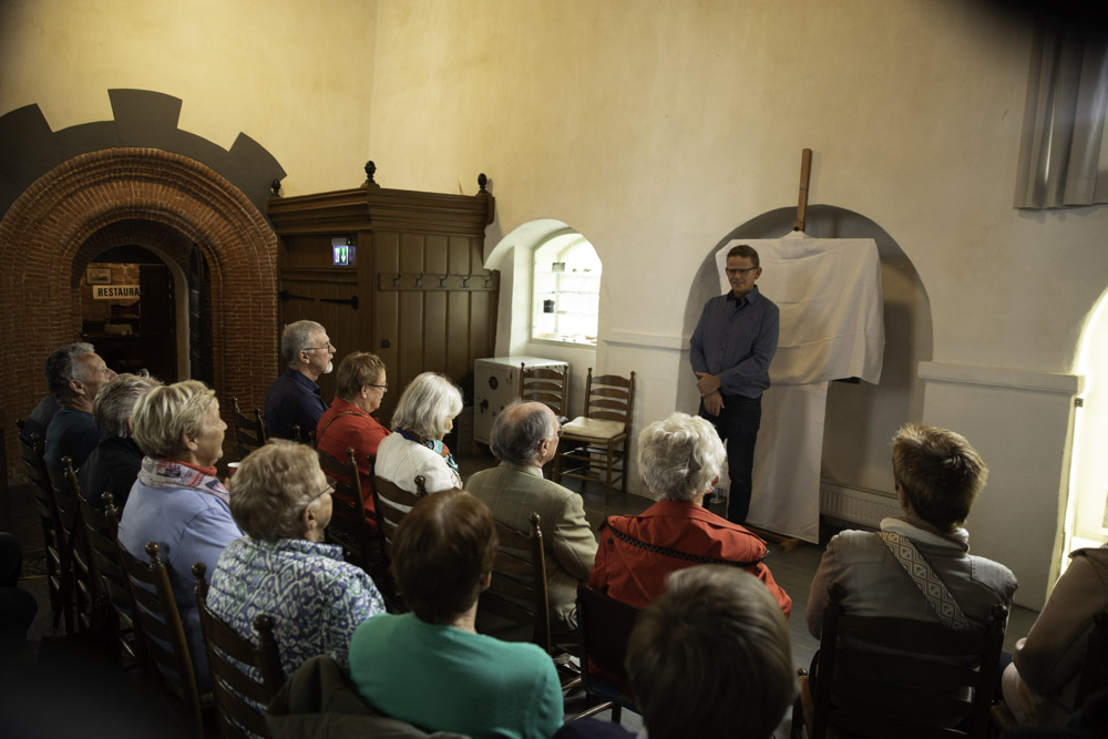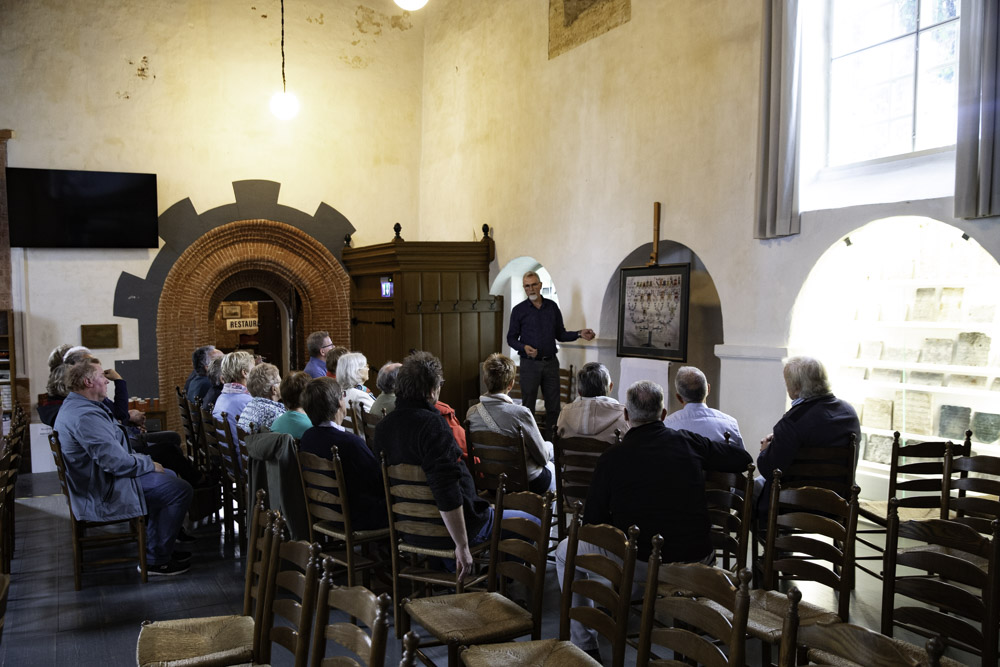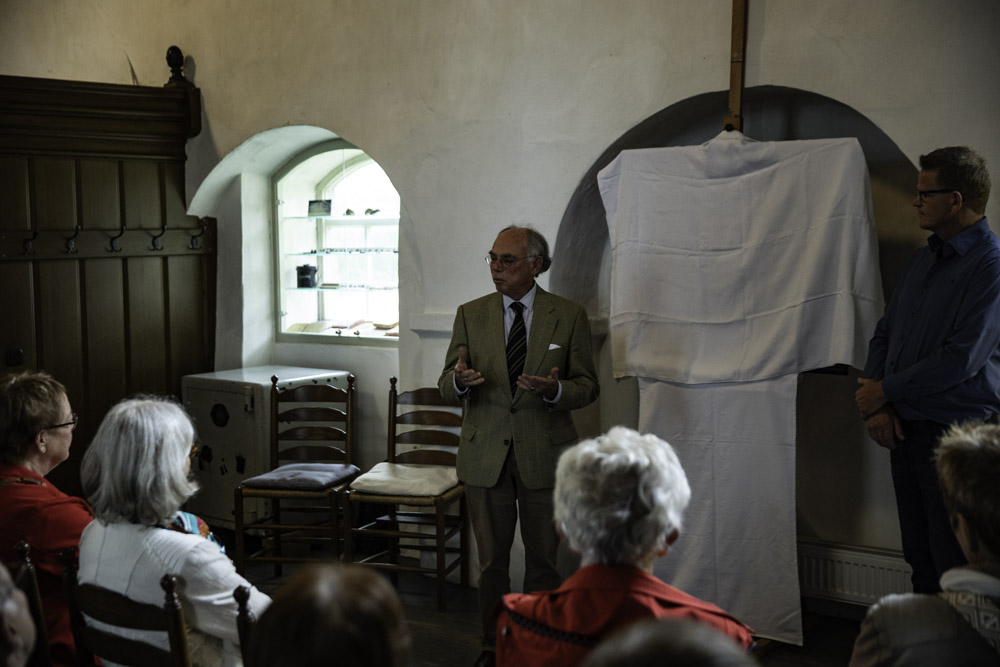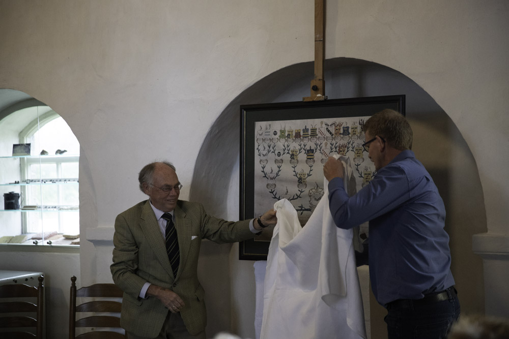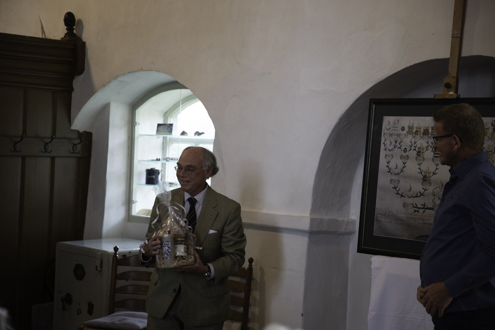 Guus de Rotte uit Oegstgeest een rechtstreekse nazaat van de laatste bewoner van het voormalige Tjaerda-slot overhandigde een cadeau aan voorzitter Gerrit de Vries.